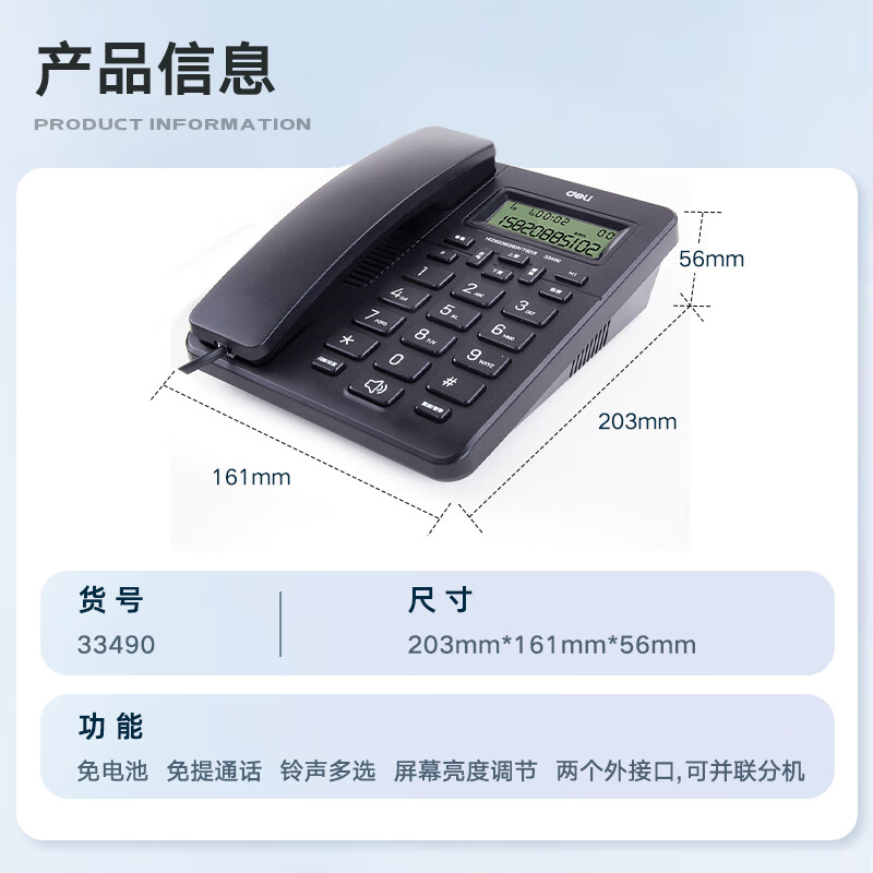 得力(deli)电话机座机 固定电话 办公家用 免提通话 大字按键 来电显示 33490黑