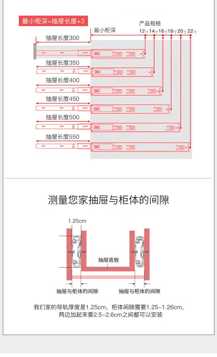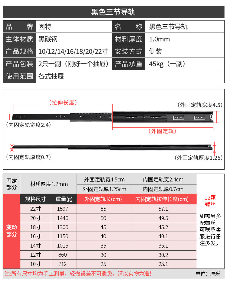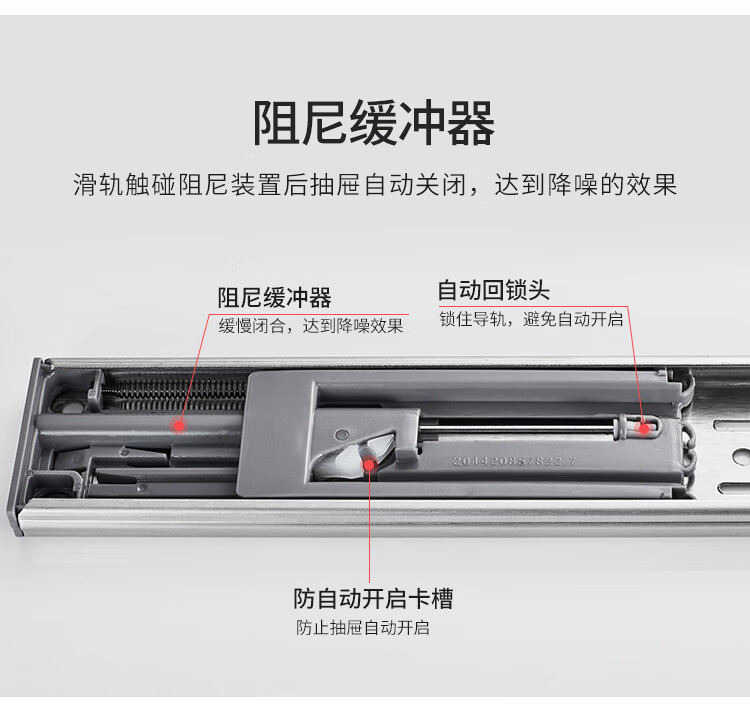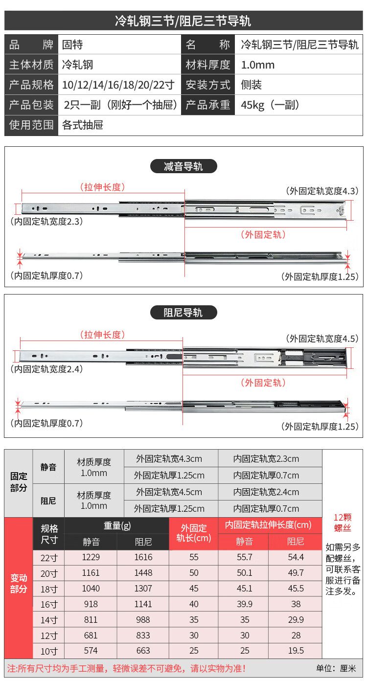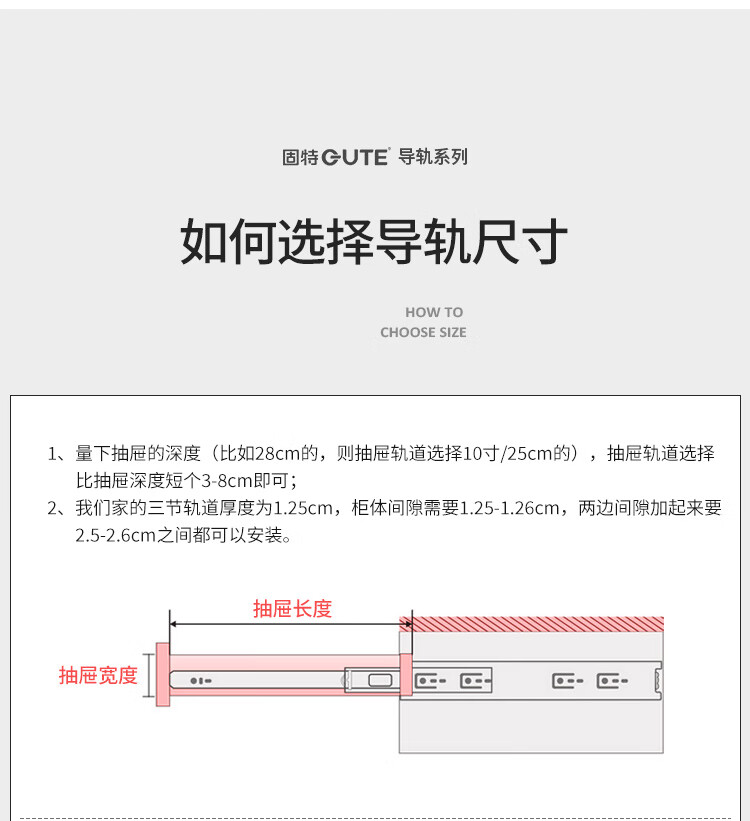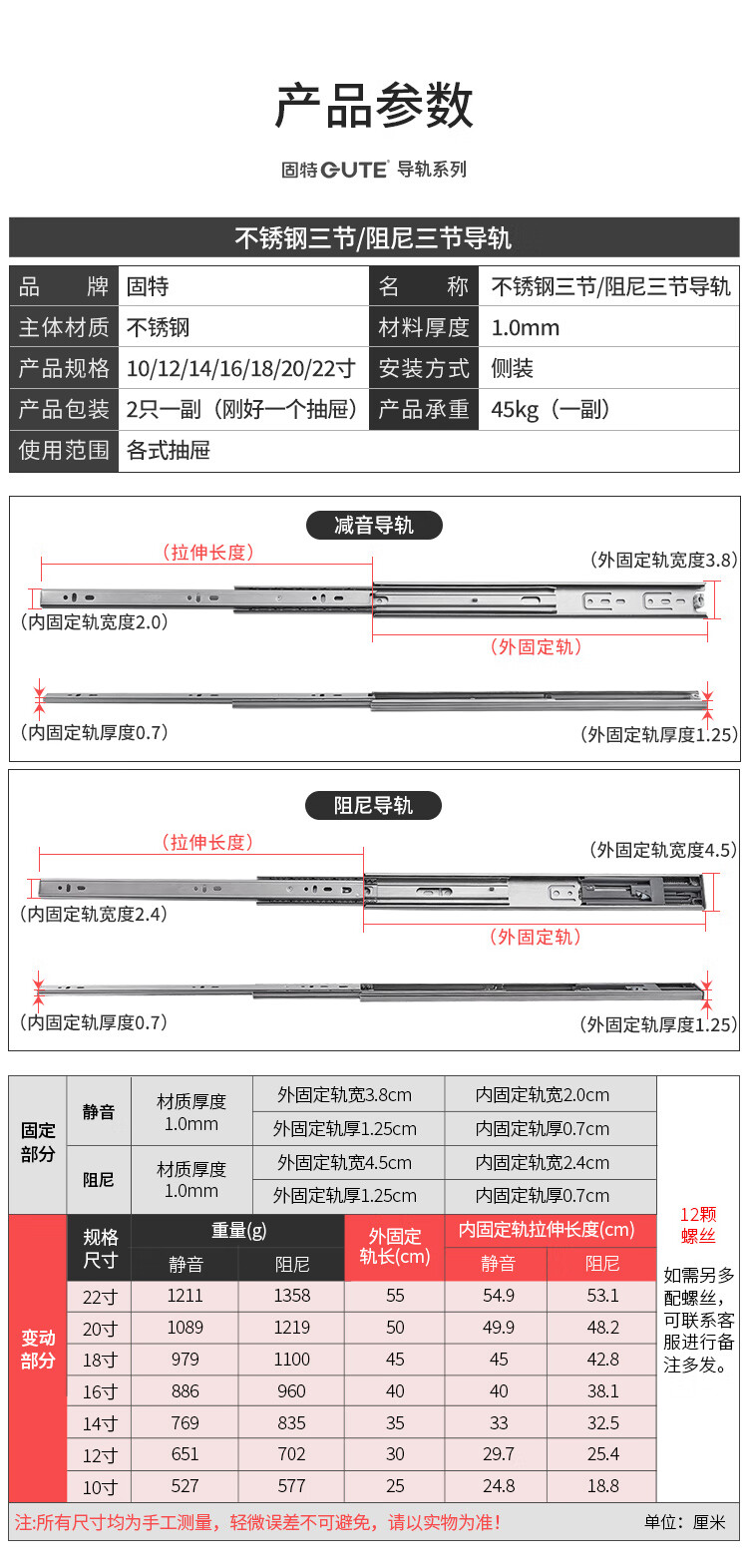 固特(GUTE)抽屉轨道不锈钢阻尼缓冲抽屉轨道三节导轨自动闭合滑轨五金滑道 不锈钢 普通款 10寸-25cm